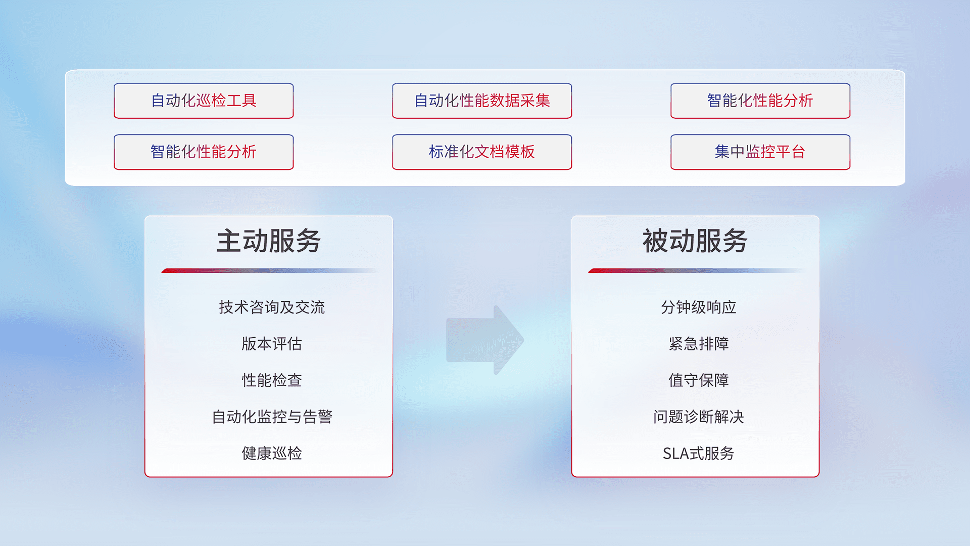 智能化工具和标准化文档,,,保障服务质量,,提供主动服务(包含技术咨询、、、版本评估、、、、性能检查、、、自动化监控与告警、、、、健康巡检)和被动服务包含(分钟级响应、、、、紧急排障、、、值守保障、、、问题诊断解决、、、SLA服务)。。
