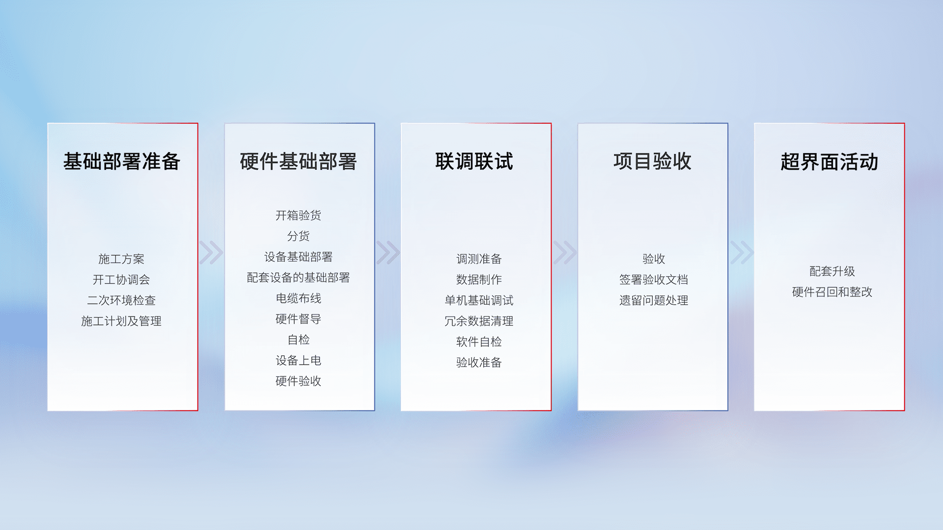 从基础部署准备、、、硬件基础部署、、、联调联试、、项目验收、、越界面活动的全过程可追溯,,保证施工质量和进度。。。。